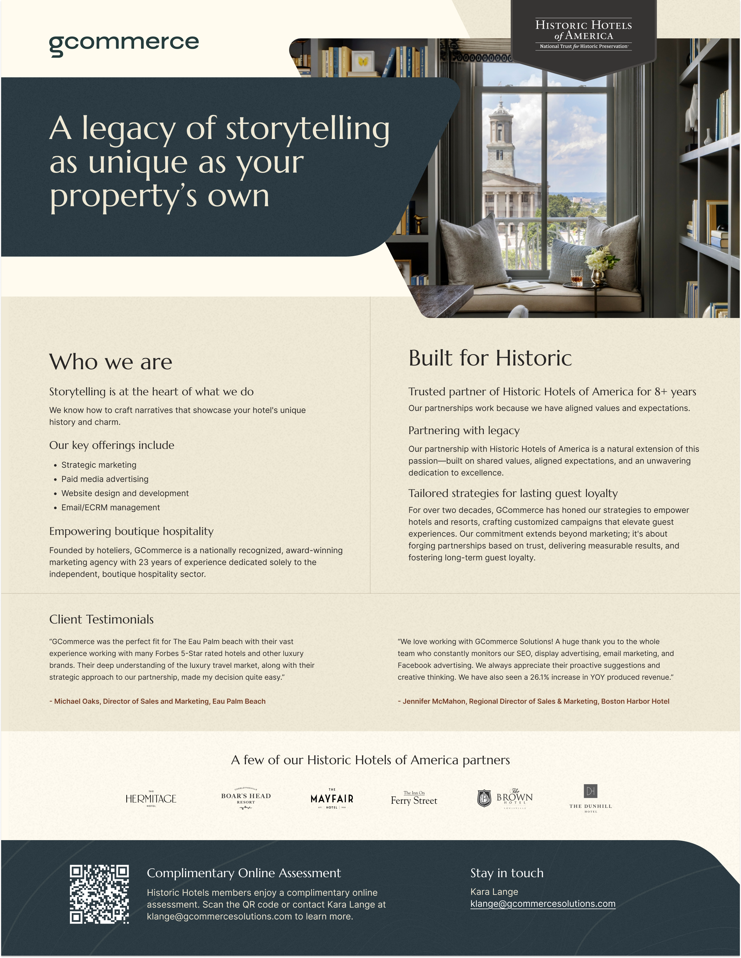 At GCommerce, storytelling is at the heart of everything we do. For over 23 years, we’ve crafted marketing strategies as unique as the hotels we represent, transforming rich histories and distinctive charms into compelling narratives that captivate luxury travelers. Our partnership with Historic Hotels of America is a natural extension of this passion—built on shared values, aligned expectations, and an unwavering dedication to excellence.